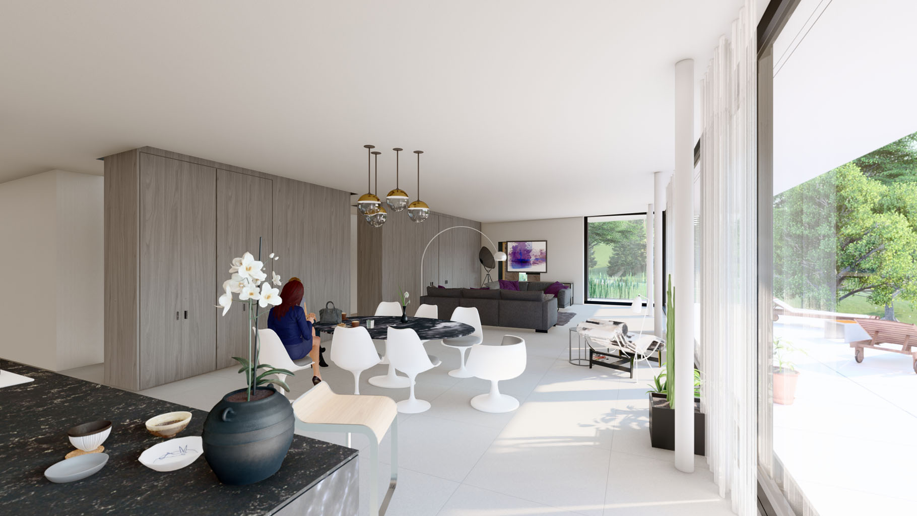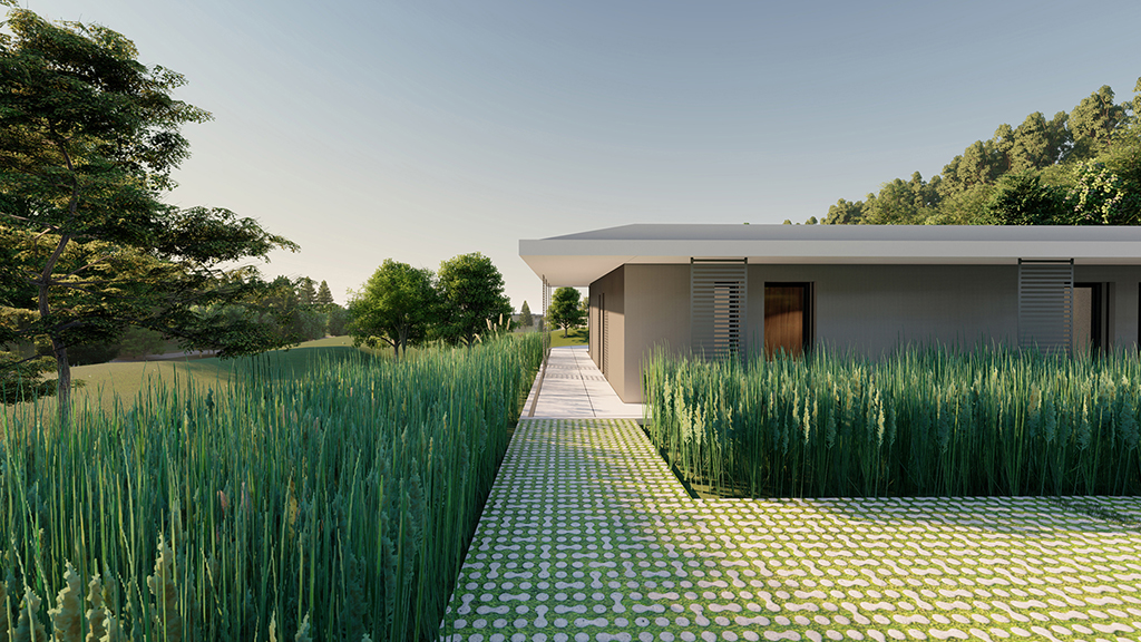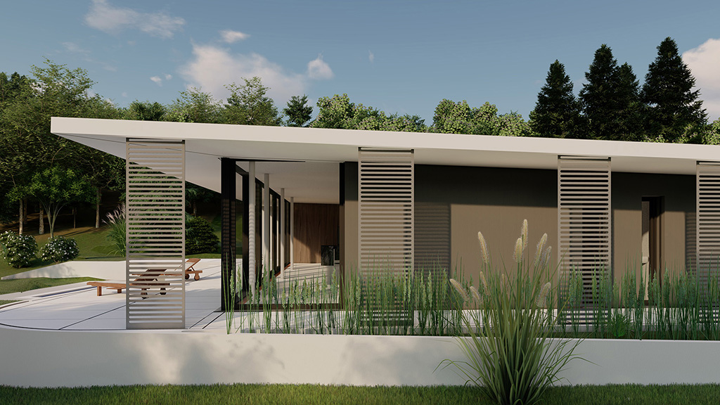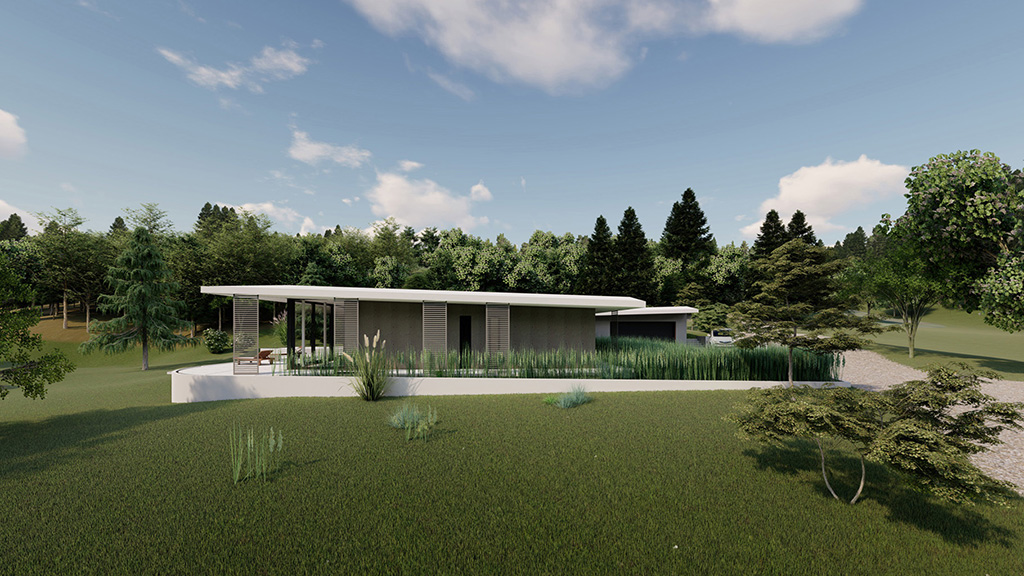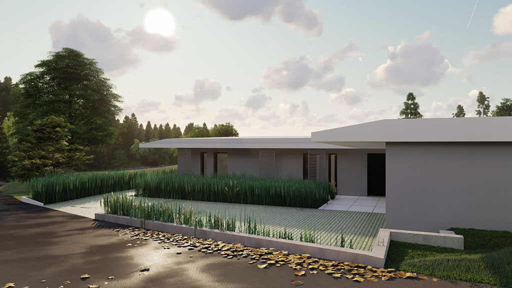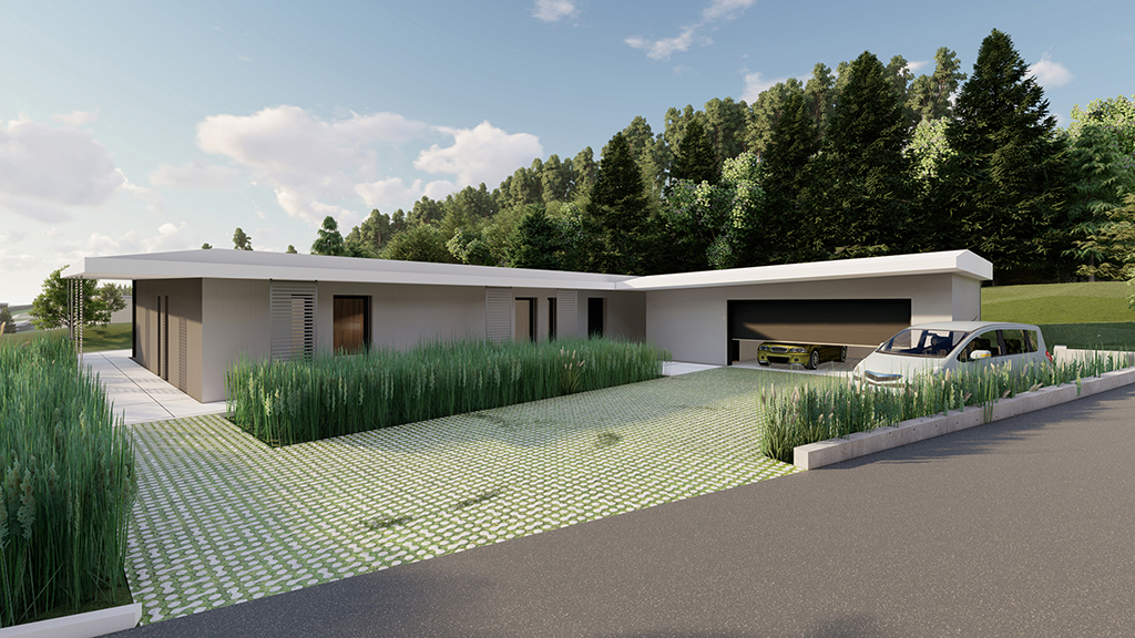 Das eingeschossige, moderne Haus befindet sich in Gratkorn, Steiermark, an einer leichten Hanglage. Der Entwurf ist bewusst einfach und reduziert gestaltet. Die Südfassade ist komplett transparent gehalten, wodurch ein freier Blick auf die umliegende Landschaft möglich ist. Ein weit auskragendes Vordach nach Süden und Westen schützt das Haus vor Sonne und Regen und erweitert gleichzeitig den Wohnraum in den Außenbereich, wodurch es als verbindendes Element zwischen Innen- und Außenraum wirkt.